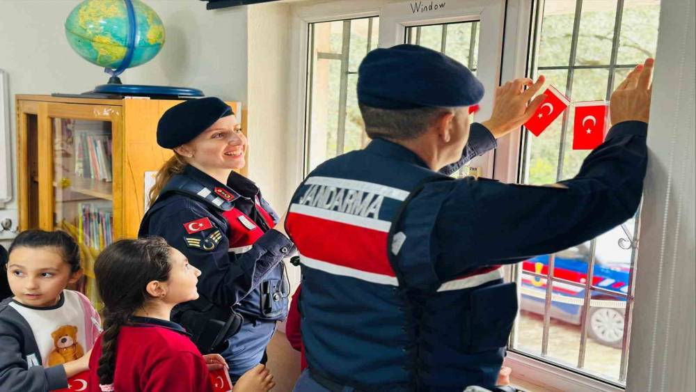 İNCİRLİOVA - İncirliova Arpadere İlkokulu’nda ’102 Yıldır Aynı Bayrak Altında, Aynı Gururla!’ temasıyla düzenlenen etkinlikte, jandarma personeli öğrencilerle birlikte sınıf süsleme çalışması yaptı. Türk bayraklarıyla okulun süslenmesiyle miniklerin Cumhuriyet coşkusu doruğa çıkarken, milli birlik ve beraberlik duygularının pekişmesi sağlandı. Etkinlikte öğrencilere cumhuriyetin anlamı, önemi ve Gazi Mustafa Kemal Atatürk’ün çocuklara verdiği değer anlatıldı. Cumhuriyet bilincinin küçük yaşta kazandırılması amacıyla yapılan etkinliğin sonunda öğrencilere balon, bayrak ve boyama kitabı hediye edildi.