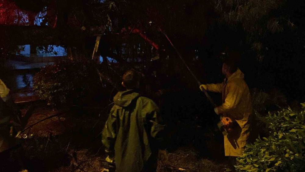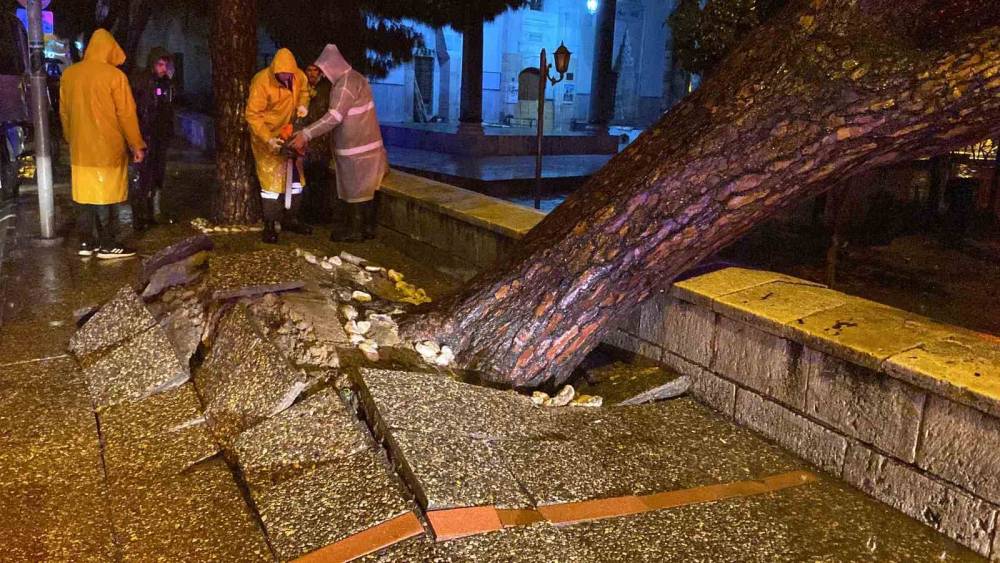 Aydın’ın Efeler ilçesi kent merkezinde Bey Camii önündeki kaldırımda bulunan çam ağacı gün boyu etkili olan sağanak yağmur nedeniyle devrilirken, gece saatlerinde yolun boş olması muhtemel bir facianın önüne geçti.