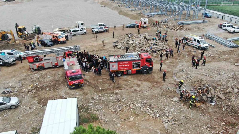 Aydın Valiliği koordinesinde gerçekleştirilen helikopter destekli saha tatbikatında, ekipler senaryo gereği tribün çökmesi sonucu 202 kişinin yaralandığı, 5 kişinin hayatını kaybettiği olaya müdahale etti.