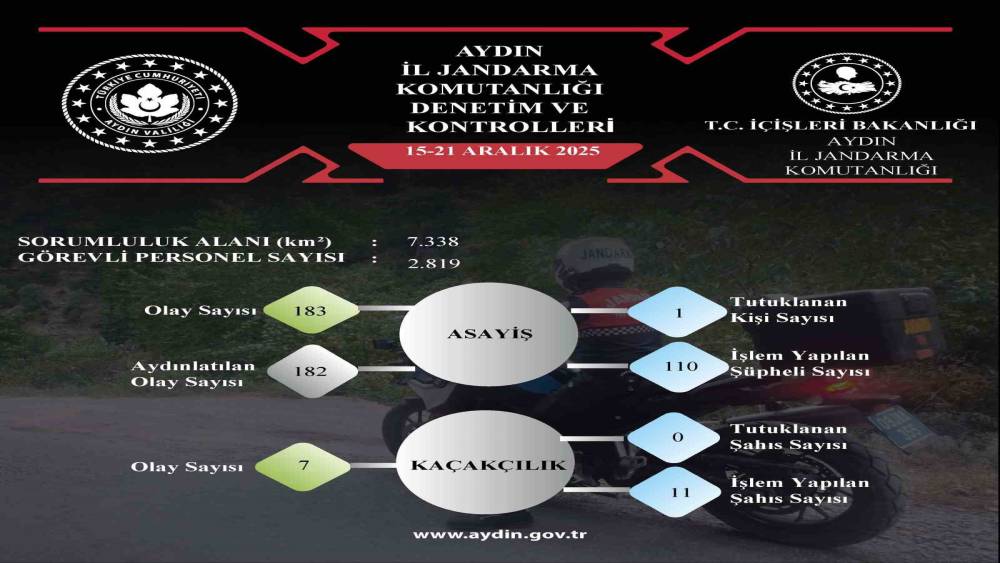 AYDIN - Aydın İl Jandarma Komutanlığı 2 bin 819 personel ile vatandaşların huzur ve güvenliği için çalışmalarını aralıksız sürdürüyor. Edinilen bilgiye göre, jandarma ekiplerinin kent genelindeki 7 bin 338 kilometrekarelik sorumluluk bölgesinde 15-21 Aralık 2025 tarihleri arasında yürütülen çalışmalarda 183 asayiş olayı meydana gelirken, bu olayların 182’si aydınlatıldı. Olaylara karıştığı tespit edilen 110 şüpheli hakkında işlem yapıldı, 1 kişi ise tutuklandı. Kaçakçılıkla mücadele kapsamında gerçekleştirilen çalışmalarda ise 7 olay tespit edildi. Bu olaylarla bağlantılı olarak 11 şüpheli hakkında işlem yapılırken, tutuklanan şahıs olmadığı öğrenildi.