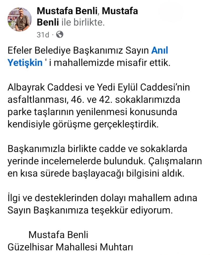 Güzelhisar Mahalle Muhtarı Mustafa Benli, ziyaretin ardından sosyal medya hesabından yaptığı paylaşımda, Efeler Belediye Başkanı Anıl Yetişkin’in mahalleye gösterdiği ilgi ve destekten duyduğu memnuniyeti dile getirdi. Muhtar Benli, hem şahsı hem de mahalle sakinleri adına Başkan Yetişkin’e teşekkür ederek, bu tür ziyaretlerin sorunların çözümünde önemli katkı sunduğunu vurguladı.