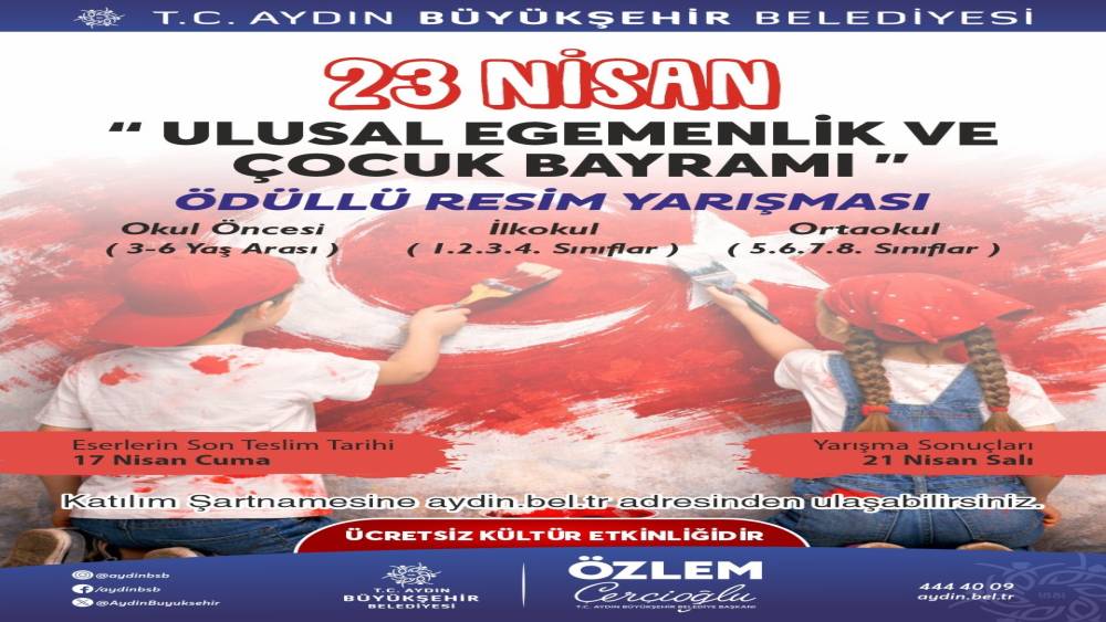 Aydın Büyükşehir Belediyesi’nin 23 Nisan temalı ödüllü resim yarışmasıyla, 3-6 yaş grubundan ortaokul öğrencilerine kadar tüm çocuklar bayram coşkusunu çizimlerine yansıtacak; başvurular 17 Nisan’a kadar kabul edilecek.