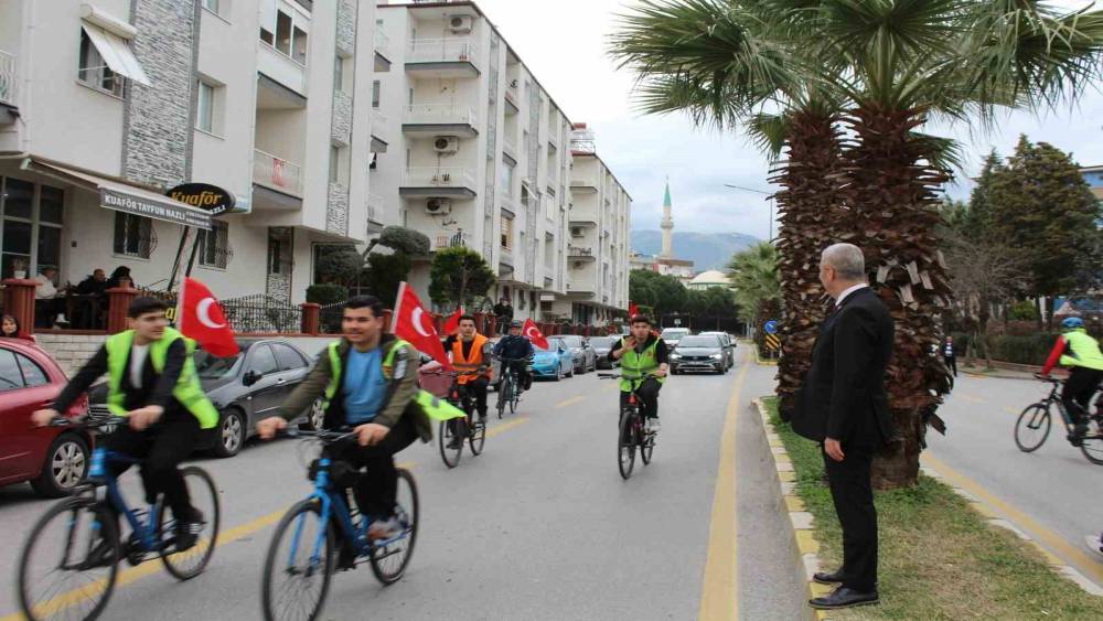 Aydın’ın Efeler ilçesinde "İstiklal Bayrakla, İstikbal Maarifle" temasıyla düzenlenen bisiklet sürüş etkinliğinde öğrenciler, Türk bayrağının manevi değerine dikkat çekmek için pedal çevirdi.