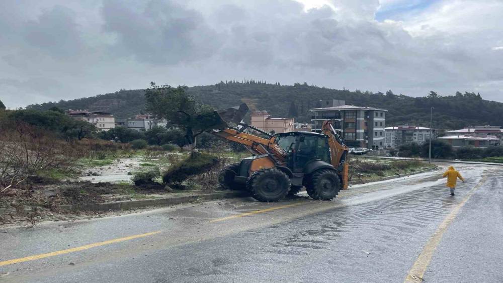 Aydın’ın söke ilçesinde sağanak yağış sonrası köküyle birlikte sel sularının getirdiği zeytin ağacı karayolunu ikiye böldü.