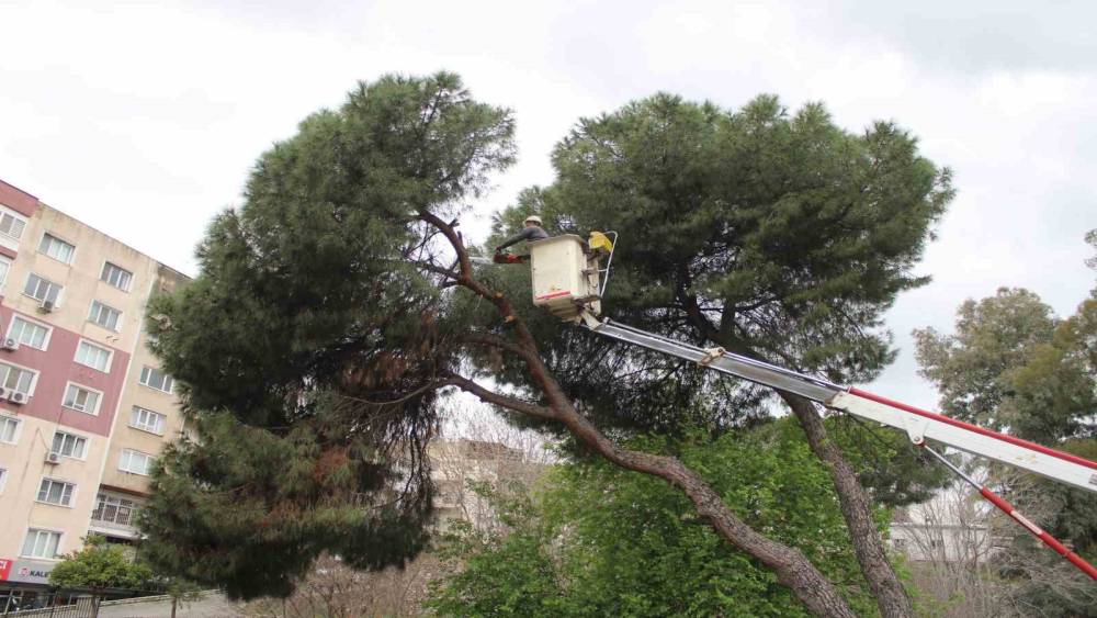 Aydın’ın Efeler ilçesinde etkili olan yağışların ardından 2 çam ağacı yan yatarken, ekiplerin hızlı müdahalesiyle ağaçlar devrilmeden budandı.
