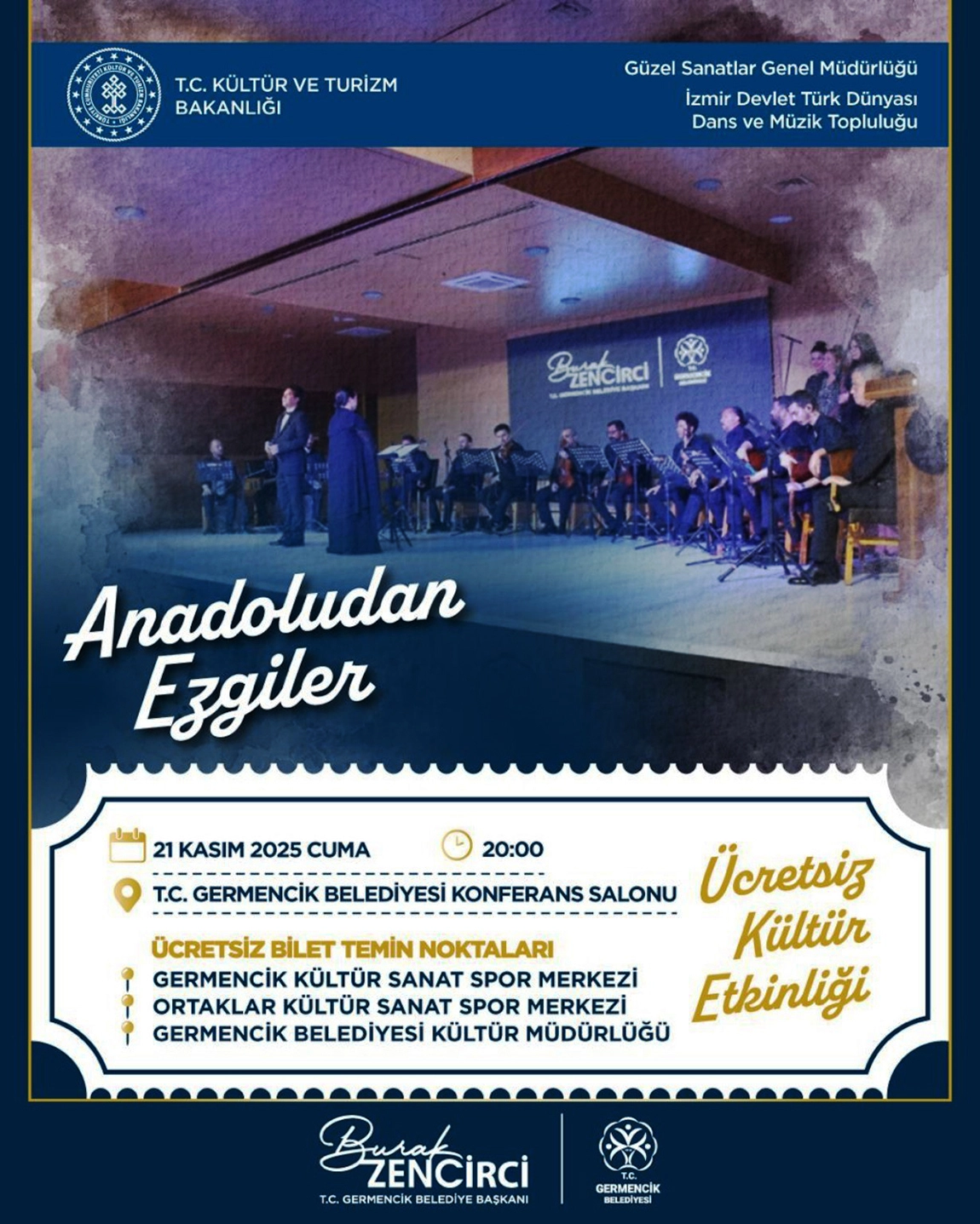 Germencik Belediyesi tarafından düzenlenecek ’Anadolu’dan Ezgiler’ konseri ile Türk müziğinin en özel eserleri vatandaşlarla buluşmaya hazırlanırken, Belediye Başkanı Burak Zencirci, herkesi konsere davet etti.