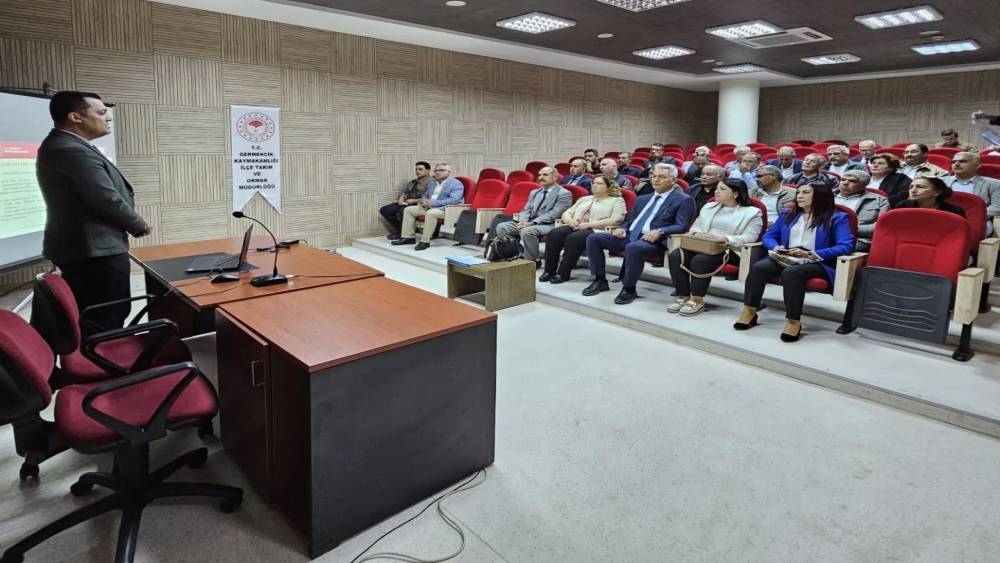 GERMENCİK - Aydın İl Tarım ve Orman Müdürlüğü tarafından yürütülen Tarım Sayımı çalışmaları kapsamında, resen kayıtlı arazilerin tespitine yönelik yapılacak uygulamalar hakkında Germencik mahalle muhtarlarına bilgilendirme toplantısı düzenlendi. Toplantı öncesinde İl Koordinatörleri Ertan Özdemir ve Murat Şahin ile Koordinasyon ve Tarımsal Veriler Şube Müdürü Mustafa Özsemerci, Germencik Kaymakamı Sultan Doğru’yu ziyaret ederek çalışmalar hakkında bilgi verdi. Germencik Kaymakamı Sultan Doğru’nun da katılım sağladığı toplantıda, İlçe Tarım ve Orman Müdürü İlknur Kavas ve konu sorumlusu personel tarafından muhtarlara tarımsal verilerin güncellenmesi, arazi tespit süreçleri ve sahada yürütülecek çalışmalar hakkında detaylı bilgiler aktarıldı.