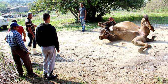 Kasapların bile tedbirli yaklaştığı deve mezbahaya ayakları bağlı şekilde alındı.