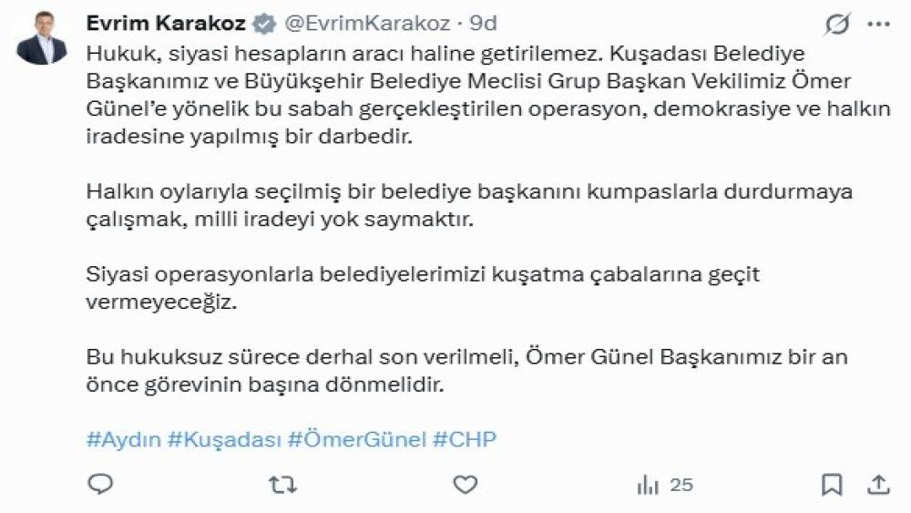 CHP Aydın Milletvekili Evrim Karakoz da, "Kuşadası Belediye Başkanımız ve Büyükşehir Belediye Meclisi Grup Başkan Vekilimiz Ömer Günel’e yönelik bu sabah gerçekleştirilen operasyon, demokrasiye ve halkın iradesine yapılmış bir darbedir. Halkın oylarıyla seçilmiş bir belediye başkanını durdurmaya çalışmak, milli iradeyi yok saymaktır. Bu hukuksuz sürece derhal son verilmeli, Ömer Günel Başkanımız bir an önce görevinin başına dönmelidir" ifadelerine yer verdi.