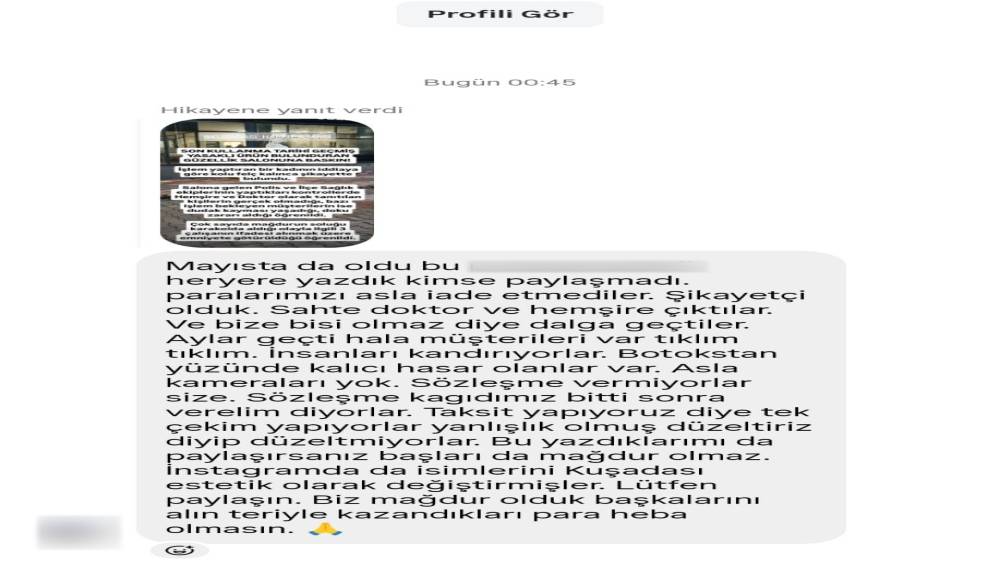 Serap Afanso yaptığı açıklamada; "Fiyatları cazip bulmam üzerine bu merkeze geldim. İşlem için Didim’den Kuşadası’na geldim. Ben ve diğer müşteriler beklerken merkeze bir grup denetleyici geldi. Ve bizlere de ’sağlığınızla oynuyorsunuz’ dediler. Burada bize doktor ve hemşire olarak tanıtılan kişilerin doktor ve hemşire olmadığını da öğrendik. Bu arada çalışan hiç kimse burada çalıştığını kabul etmedi. Sağlık görevlileri ve polislerin tutanaklarını tutmasının ardından şahıslar ifadeleri alınmak üzere polis merkezine götürüldü. Bizler de mağdurlar olarak ilgili merkez hakkında şikayetçi olacağız" diye konuştu.
