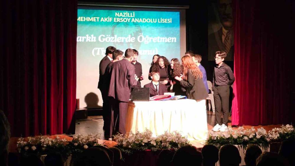 Programın ikinci bölümü Nazilli Belediyesi Tiyatro salonunda devam etti. İlk olarak salona geçilmeden önce Atatürk ve öğretmen temalı öğrenciler tarafından hazırlanan sergi açılışı yapıldı. Saygı duruşu ve İstiklal Marşının söylenmesinin ardından İlçe Milli Eğitim Müdürü İsmail Şimşek, gününü anlam ve önemini belirten konuşma yaptı. Şimşek konuşmasında, öğretmenliğin sevgi, özveri, sabır ve hoşgörüyle yapılan kutsal ve onurlu bir meslek olduğunu vurguladı. Şimşek, "Öğretmenlik, sadece bir meslek değil; bir ideal, bir adanmışlık mesleğidir. Gücünü sevgiden alan, dünyanın en kutsal ve önemli mesleklerden biridir. Öğretmenlik; emek, özveri, sabır ve hoşgörü isteyen, bedeli hiçbir maddi karşılıkla ölçülemeyecek kadar değerli, onurlu, saygın bir meslektir. Öğretmen, tüm birikimiyle karanlığı aydınlığa çeviren, bir çocuğun kalbine dokunarak onu geleceğe hazırlayan kişidir. Hiçbir zafer hikâyesi yoktur ki, bir öğretmenin katkısı olmamış olsun. Yine bu ülkede hiçbir kimse yoktur ki, milli ve manevi değerlerimize sahip çıkarak iyi işler yapıp ta, bir öğretmenin atölyesinden geçmemiş olsun. Cumhuriyetimizin kurucusu Gazi Mustafa Kemal Atatürk, "Öğretmenler! Yeni nesil, sizin eseriniz olacaktır." derken, bu büyük sorumluluğu ve değeri en güzel şekilde ifade etmiştir. Bizler de bu emaneti, Cumhuriyetimizin ikinci yüzyılında; Türkiye Yüzyılı’nın eğitim vizyonuyla taşımaya kararlıyız. Bu duygu ve düşüncelerle, başta Başöğretmenimiz Gazi Mustafa Kemal Atatürk olmak üzere bu kutsal görevi yerine getirirken, şehit düşen ve hayatını kaybeden tüm öğretmenlerimizi saygı, minnet ve rahmetle anıyor; tüm öğretmenlerimizin 24 Kasım Öğretmenler Gününü kutluyorum" dedi.