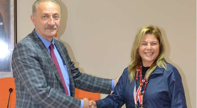 Antalya'da yapılan 2015 Veteranlar Açık Hava Türkiye Şampiyonası'nda gümüş ve bronz madalya kazanan Didim Belediyespor Okçuluk takımı sporcusu ve antrenörü Ebru Şanal Aydemir, Belediye Başkanı A. Deniz Atabay’ı ziyaret etti.