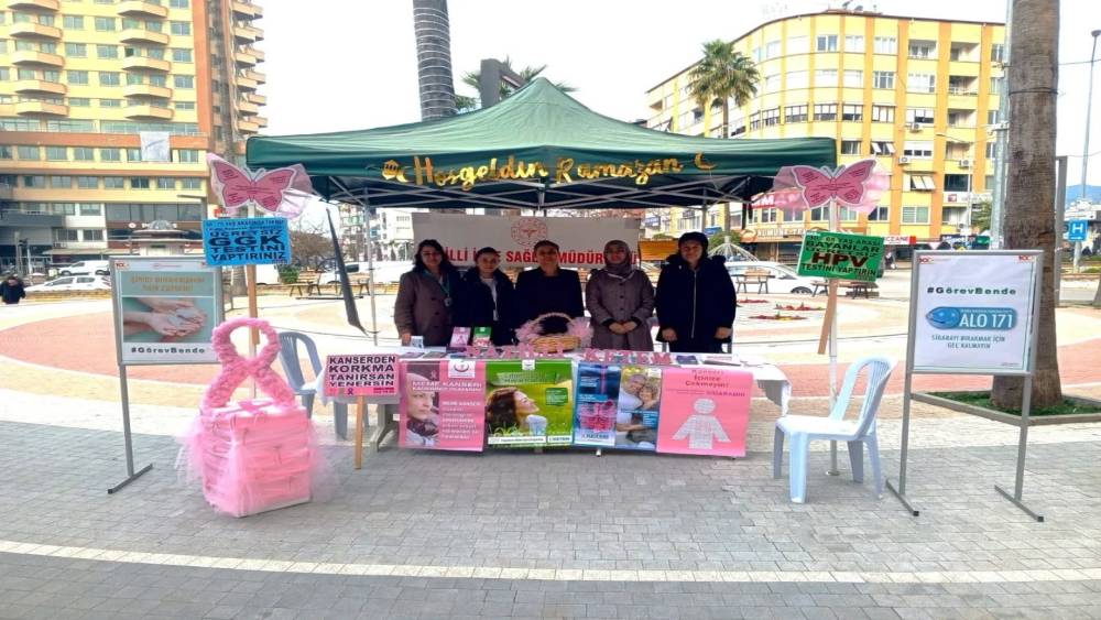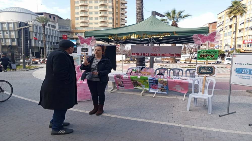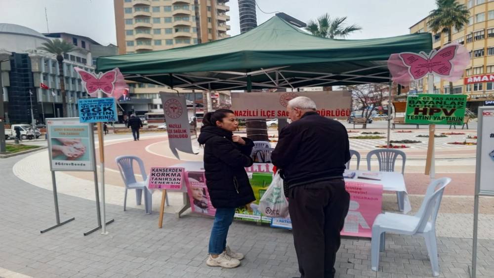 Aydın’ın Nazilli ilçesinde Ramazan ayı kapsamında kurulan sağlık bilgilendirme standında vatandaşlara kanser taramaları, sigara bırakma hizmetleri ve ücretsiz koruyucu sağlık uygulamaları anlatılarak erken teşhisin önemi vurgulandı.