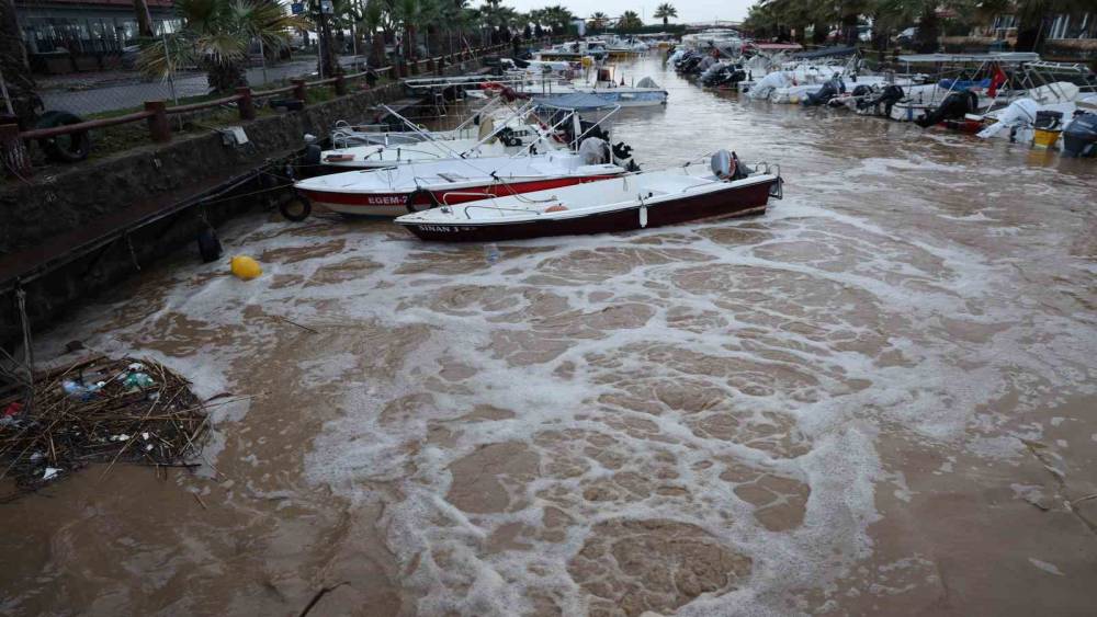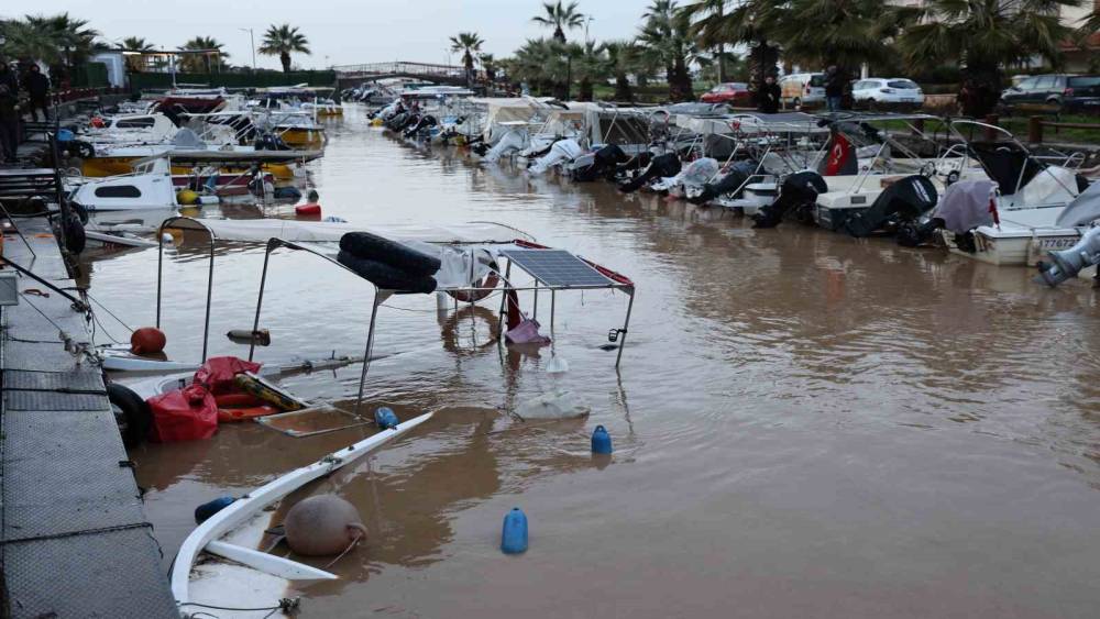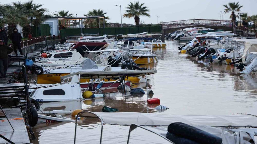 Aydın’ın Kuşadası ilçesinde etkili olan sağanak yağışla beraber oluşan sel sebebiyle Davutlar Balıkçı Barınağı’nda bağlı tekneler zarar görürken, bazı tekneler battı.