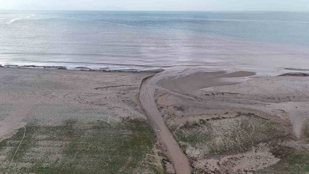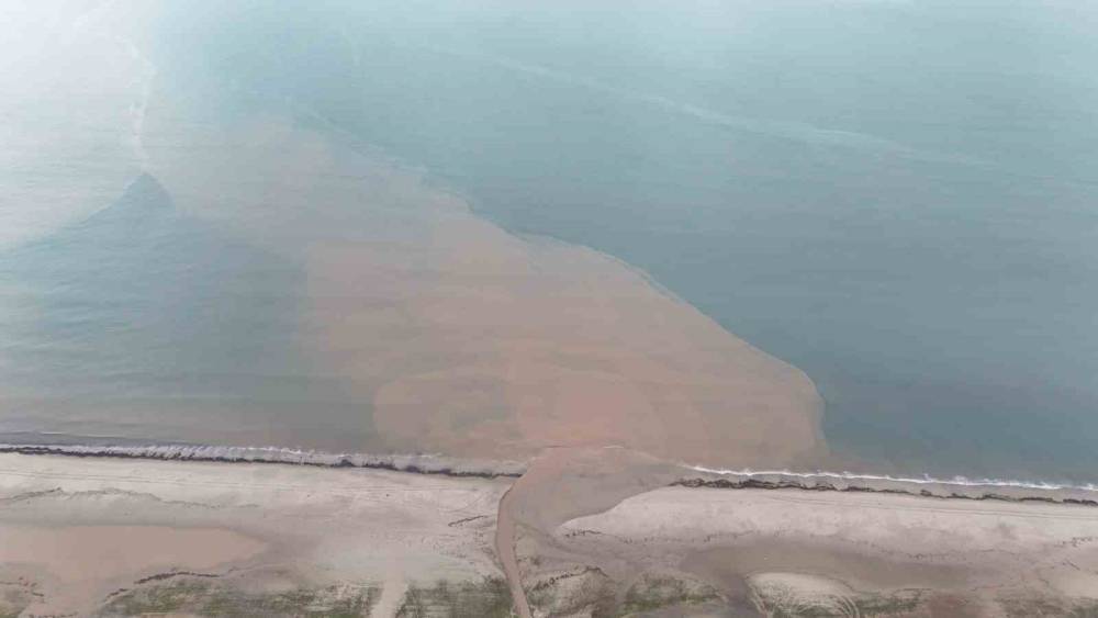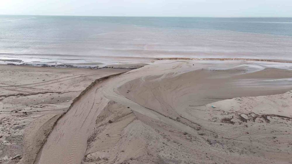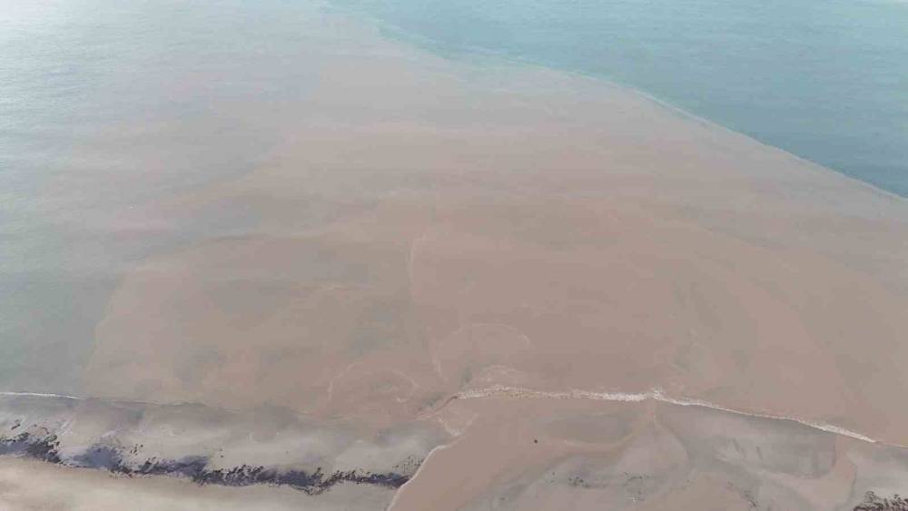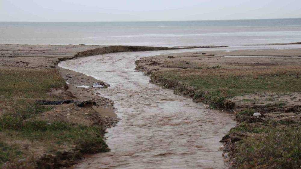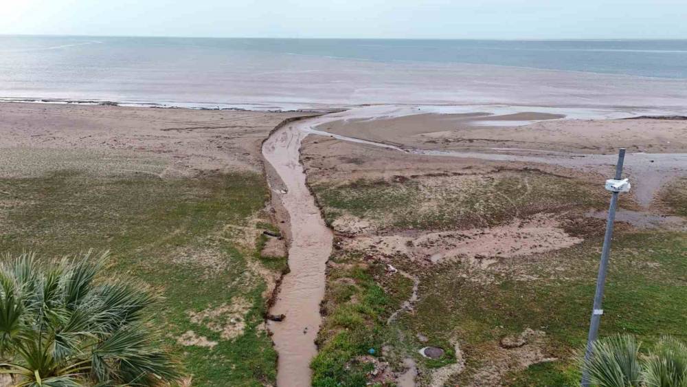 Aydın’ın Kuşadası ilçesinde etkili olan sağanak yağışın ardından taşkınlar yaşanırken, plajda yarıklar oluşturarak denize akan sel suları denizin rengini değiştirdi.