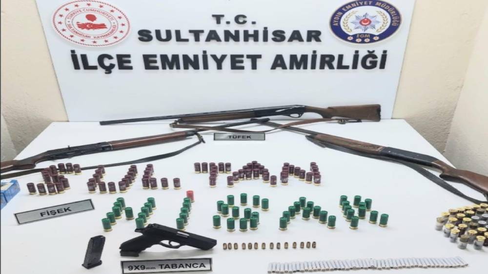 Sultanhisar İlçe Emniyet Müdürlüğü koordinesinde ruhsatsız silahın iş yerinde veya evde bulundurulmasına yönelik yürütülen çalışmalar kapsamında ekipler, M.İ. isimli şahsın ruhsatsız silah bulundurduğu bilgisine ulaştı. Şüpheli şahsın adresinde yapılan aramada 1 adet ruhsatsız tabanca ve tabancaya ait şarjöre basılı halde 9 adet fişek, 2 adet ruhsatsız av tüfeği ve tüfeklere ait 12 kalibre 184 adet dolu kartuş, 50 adet pipet mermisi diye tabir edilen fişek ele geçirildi. Şüpheli M.İ. yakalanarak gözaltına alınırken, hakkında adli işlem başlatıldı.