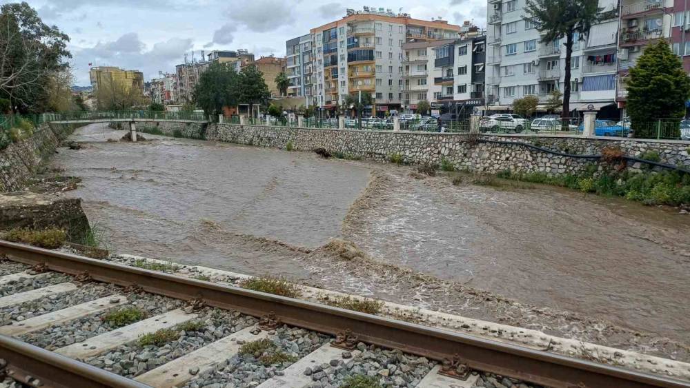 Aydın’ın merkez ilçesi Efeler’de etkili olan sağanak yağışın ardından yağmur suları Tabakhane Deresi’ni coştururken, derede su seviyesi yükseldi.