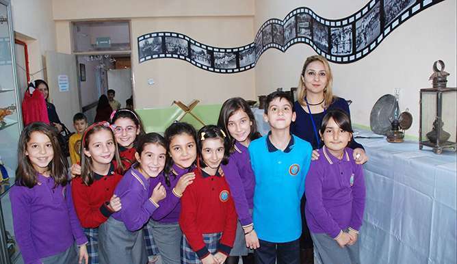 AYDIN- Aydın İl Milli Eğitim Müdürlüğü ve Aydın Müze Müdürlüğü'nün 2016-2017 öğretim yılında öğretim yılında 'Müze Okul Eğitim Projesi' kapsamında Yedieylül İlkokulu 4/D sınıfı öğrencilerinin hazırlamış olduğu müzede öğrencilerin anneanne ve dedelerinin ebeveynlerinden kalan eşyalardan oluşan kandil, lambalık, gaz lambası, köstekli saat, ibrik, demir makas, bakraç, rahle gibi bir çok antika yer aldı.