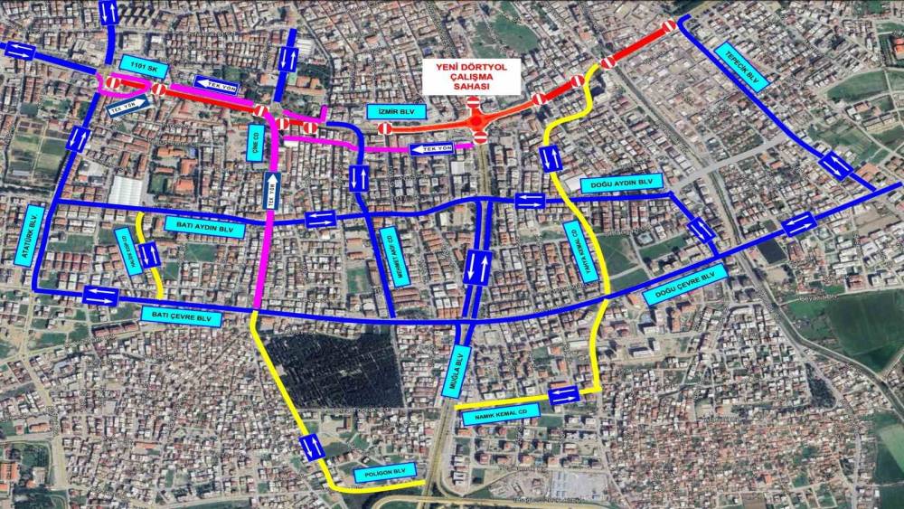 Astim Kavşağı (Denizli Aydın Yolu) - Havaalanı Bulvarı - Afrodisyas Bulvarı - Çevre Bulvarı - Çine Caddesi ya da Atatürk Bulvarı - İzmir Bulvarı’nı kullanacak. İzmir yönünden Denizli yönüne gitmek isteyenler, İzmir Bulvarı - Atatürk Bulvarı - Çevre Bulvarı - Afrodisyas Bulvarı - Havaalanı Bulvarı - Astim Kavşağı (Denizli Aydın Yolu) kullanacak. Güney - Doğu/ Doğu - Güney / Güney - Batı / Batı - Güney Yönleri, Muğla yönünden Denizli yönüne gitmek isteyenler: Muğla Bulvarı - Çevre Bulvarı - Afrodisyas Bulvarı - Havaalanı Bulvarı - Astim Kavşağı (Denizli Aydın Yolu) kullanacak. Denizli yönünden Muğla yönüne gitmek isteyenler, Astim Kavşağı (Denizli Aydın Yolu) - Havaalanı Bulvarı - Afrodisyas Bulvarı - Çevre Bulvarı - Muğla Bulvarı kullanacak. Muğla yönünden İzmir yönüne gitmek isteyenler, Muğla Bulvarı - Çevre Bulvarı ya da Batı Aydın Bulvarı - Çine Caddesi ya da Atatürk Bulvarı - İzmir Bulvarı’nı kullanacak. İzmir yönünden Muğla yönüne gitmek isteyenler, İzmir Bulvarı - Atatürk Bulvarı - Çevre Bulvarı - Muğla Bulvarı’nı kullanacak. Güney - Kuzey / Kuzey - Güney Yönleri, Kuzey yönünden İzmir ve Denizli bulvarlarının güneyine geçmek isteyenler: Adnan Menderes Bulvarı’nın Süleyman Seba Caddesi ile Albay Şefik Caddesi kesişiminden itibaren kapalı olması nedeniyle Atatürk Bulvarı, Sağlık Caddesi, Egemenlik Bulvarı ve Sanayi Caddesi güzergahlarını kullanabilecekler. Güney yönünden İzmir ve Denizli bulvarlarının kuzeyine geçmek isteyenler: Yeni Dörtyol Kavşağı ile İmam Hatip Kavşağı arası kapalı olacağından Tepecik Bulvarı, Egemenlik Bulvarı, 522 Sokak, Mehmet Akif Caddesi, Çine Caddesi ve Atatürk Bulvarı güzergahlarını kullanabilecekler.
