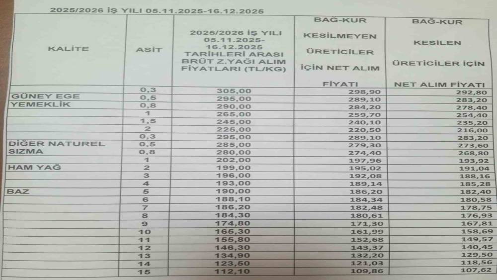 Türkiye’nin önemli tarım kentlerinden olan Aydın’da zeytinde sezonu hareketliliği sürerken, zeytinyağı fiyatları da açıklandı. Tariş Zeytin ve Zeytinyağı Birliği tarafından açıklanan fiyatlara göre; yemeklik yağlarda 0,3 asit 305 TL, 0,5 asit 295, 0,8 asit 290 TL, 1 asit 265 TL, 1,5 asit 245 TL, 2 asit 225 TL olarak açıklandı. Diğer naturel sızma yağlarda ise; 0,3 asit 295 TL, 0,5 asit285 TL, 0,8 Asit 280 TL, 1 asit ham yağ ise 202 TL olarak açıklandı.