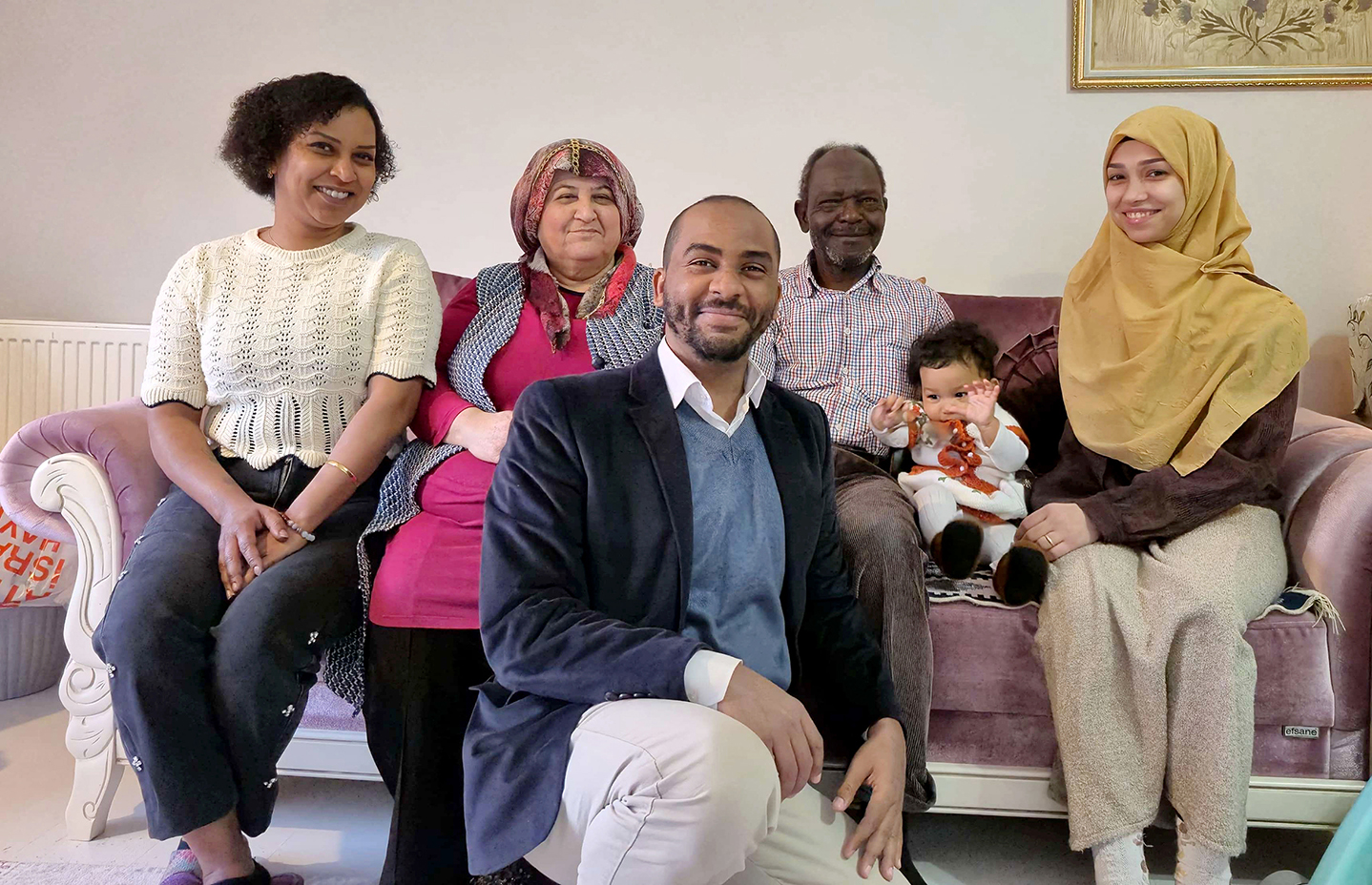 Yukarıda Annem, Babam solda ablam, sağda eşim Mine, ben ve ailemizin en küçük bireyi Nil Meva Aydınoğlu görülmekte.