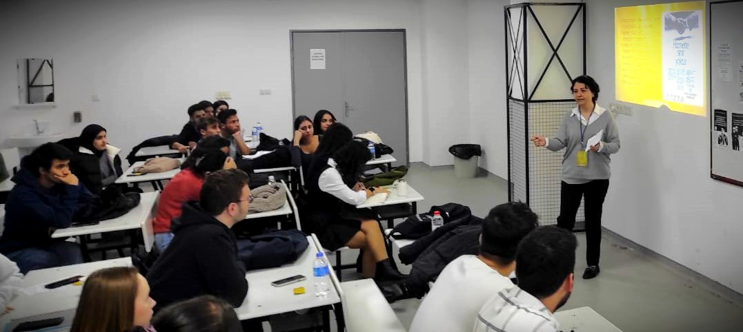 Sağda ADÜ İletişim Fakültesi öğrencisi iken reklamcılık konusunda sunum yaparken.