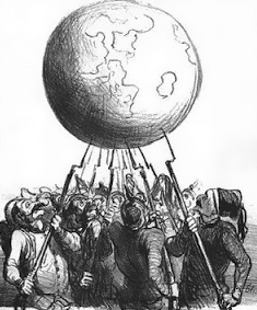Daumier'in 1866 tarihli L'Equilibre Européen adlı karikatürü, farklı ulusların askerleri süngülerin üzerinde dünyayı sallarken güç dengesini temsil ediyor.